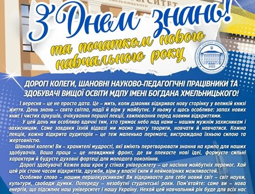 Привітання ректора Мелітопольського державного педагогічного університету імені Богдана Хмельницького, доктора психологічних наук, доцента Фалько Наталі Миколаївни з нагоди Дня Знань та початку нового навчального року!