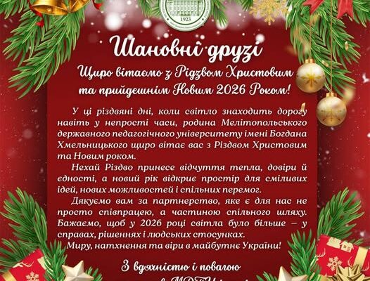 Привітання колективу Мелітопольського державного педагогічного університету імені Богдана Хмельницького на чолі з ректором, професором Наталею Фалько партнерам університету зі світлим святом Різдва Христового!