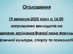 19 вересня 2025 року о 14.00 запрошуємо викладачів на розширене засідання Вченої ради факультету фізичної культури, спорту та психології
