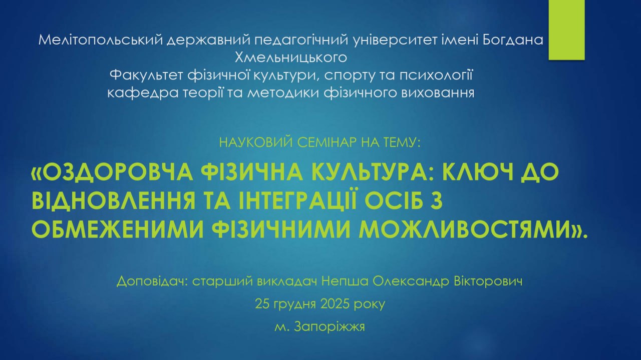 24 грудня 2025 року на кафедрі теорії та методики фізичного виховання відбувся науковий семінар на тему «Оздоровча фізична культура: ключ до відновлення та інтеграції осіб з обмеженими фізичними можливостями».